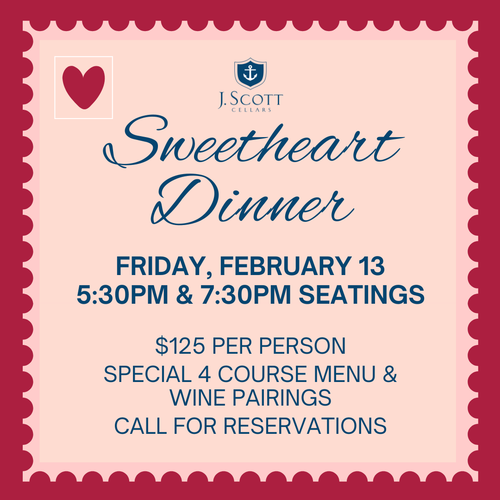 Join us for an intimate Sweetheart Dinner designed to celebrate love, great food, and exceptional wine. This special Friday evening features a four-course specialty menu crafted by guest chef Erika Kennington, with each course thoughtfully paired with a J. Scott wine.